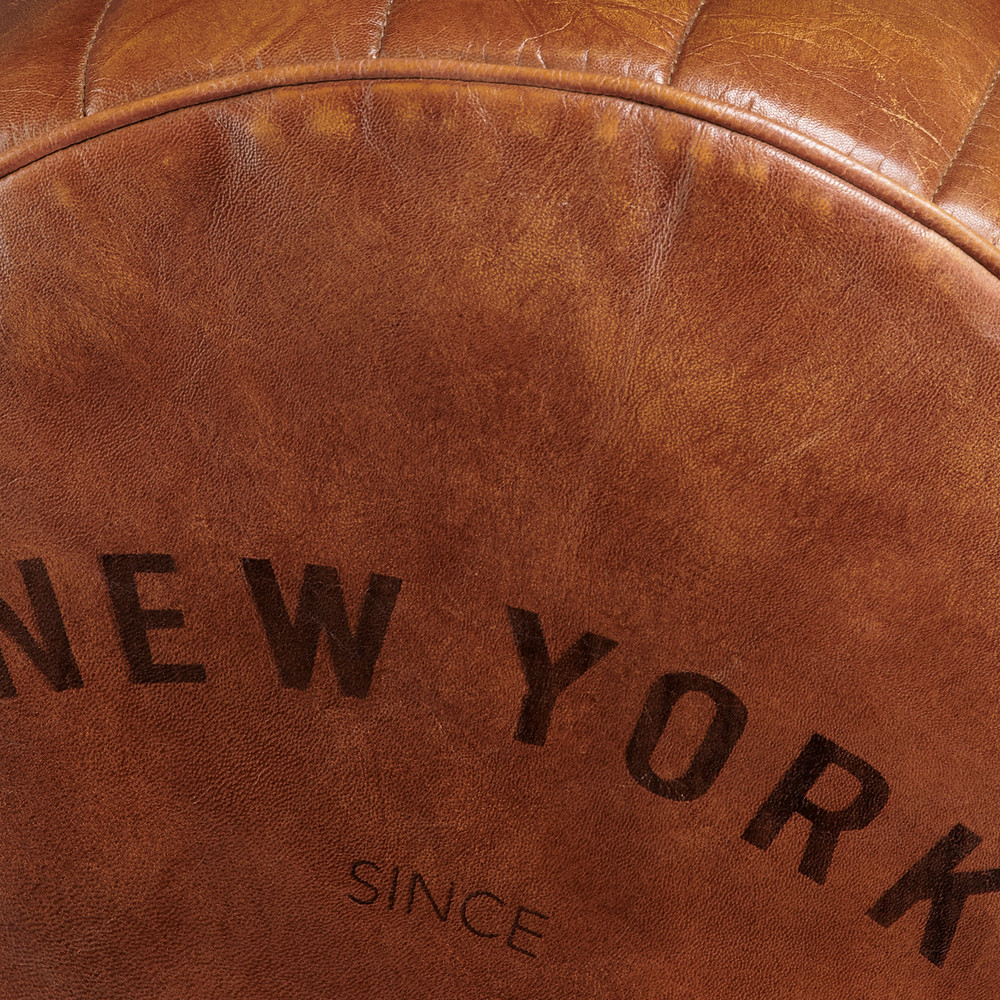 Assise gรฉnรฉreuse et look rรฉsolument vintage : pas de doute, le pouf rond en cuir marron ASHER va vous faire craquer !