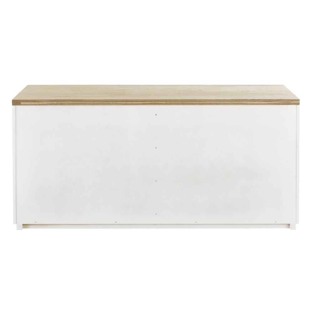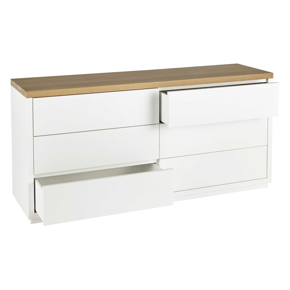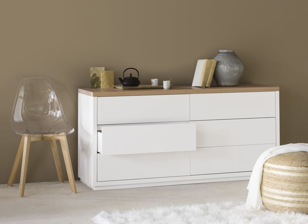 Avec ses 6 grands tiroirs sur coulisses mรฉtalliques, la commode blanche AUSTRAL vous offrira un beau volume de rangement. Recouverte par un plateau en chรชne massif, cette commode blanche s’introduira facilement dans une ambiance contemporaine ou scandinave. Le dรฉtail dรฉco : le plateau en chรชne massif qui contraste avec le blanc. Vous aimerez : les tiroirs ร ouverture par pression.