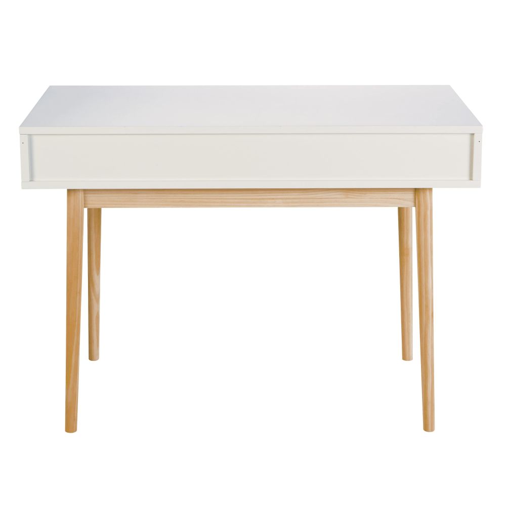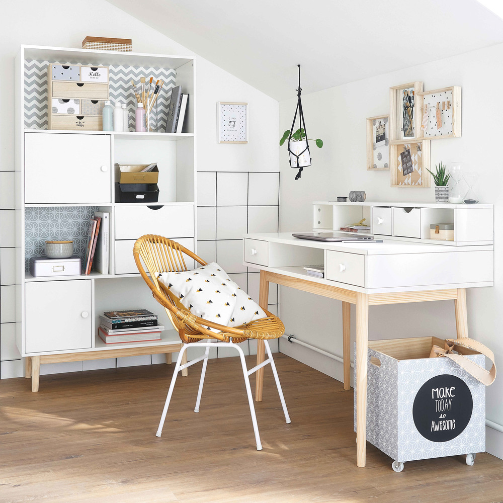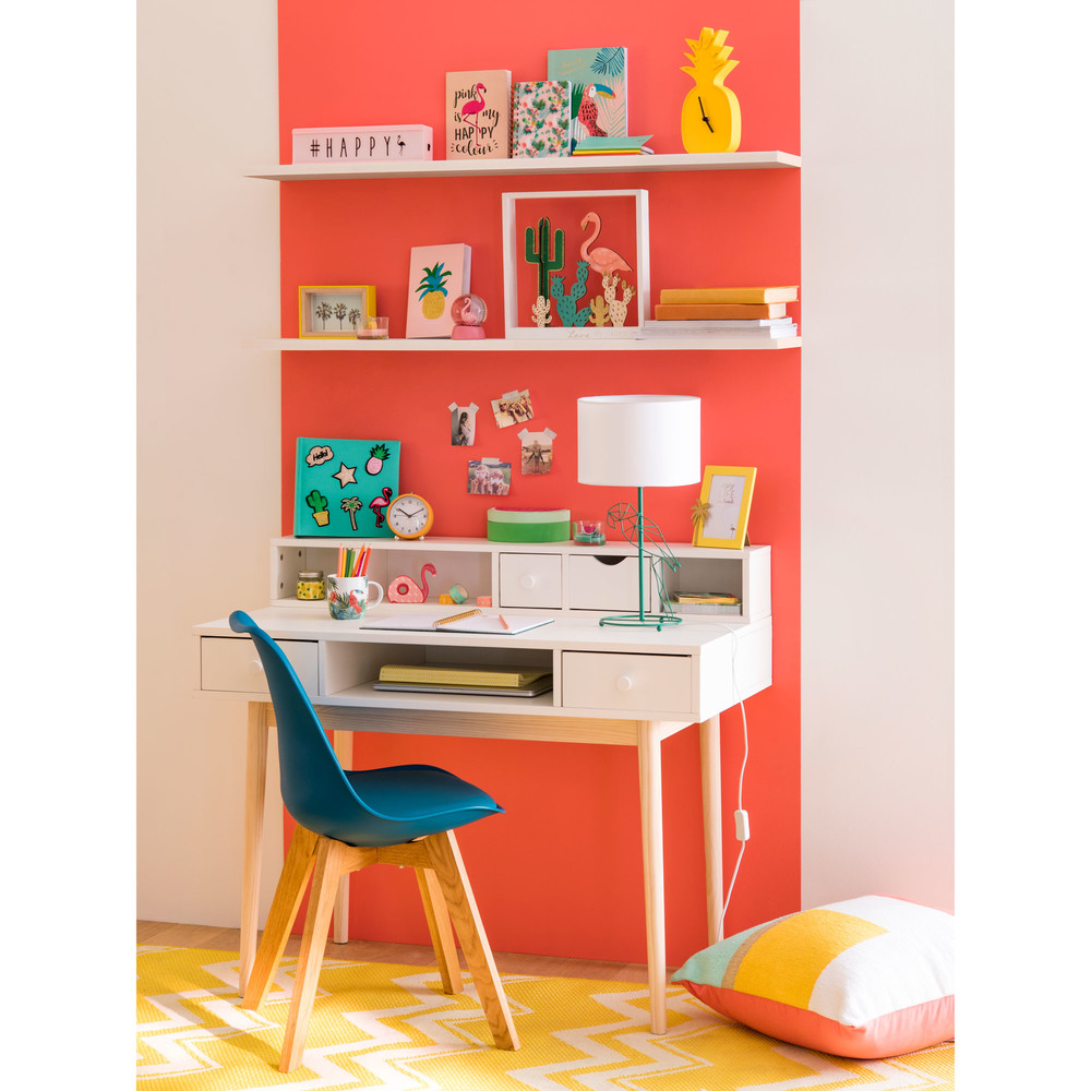 On parie que votre ado prendra goût à faire ses devoirs sur son nouveau bureau 2 tiroirs blanc JOY ! Hissé sur ses quatre pieds obliques, ce bureau blanc et bois s’inspire directement de la tendance déco scandinave. Grâce à ses deux tiroirs et sa niche centrale, le rangement est assuré pour le petit matériel et les fournitures scolaires ! Une chaise de bureau complétera un espace de travail réussi.