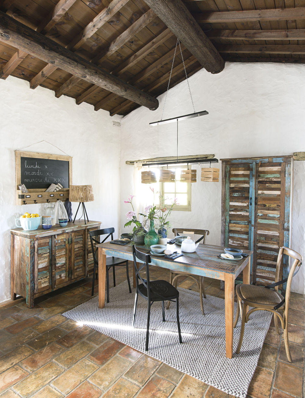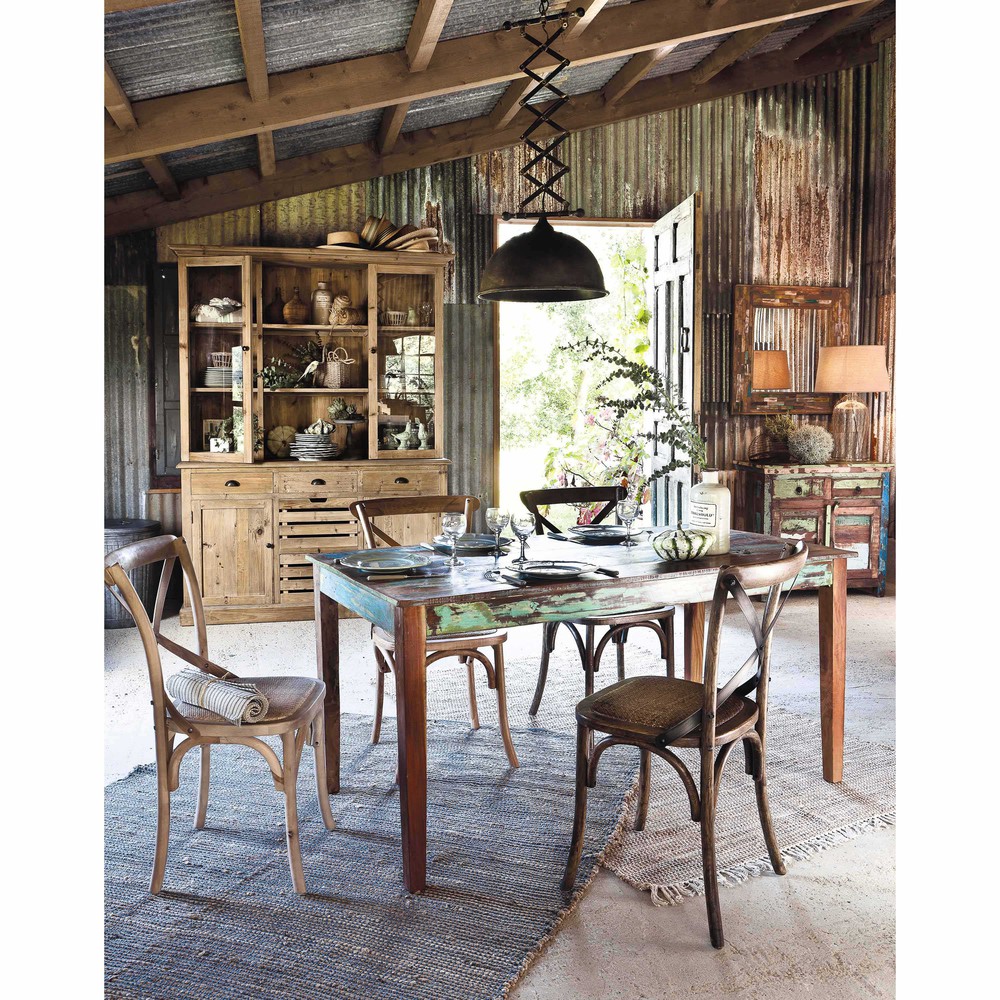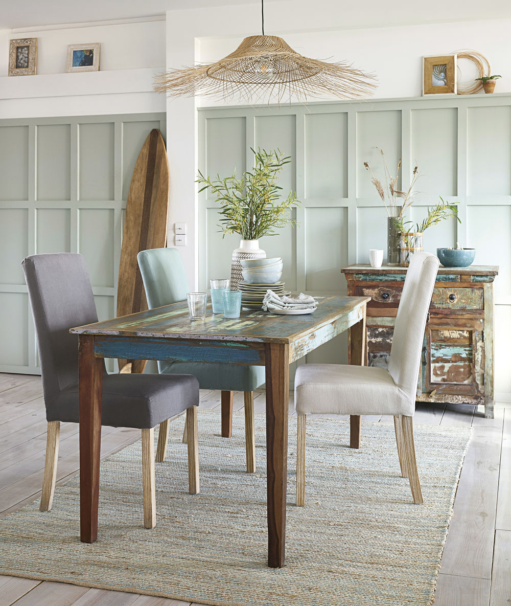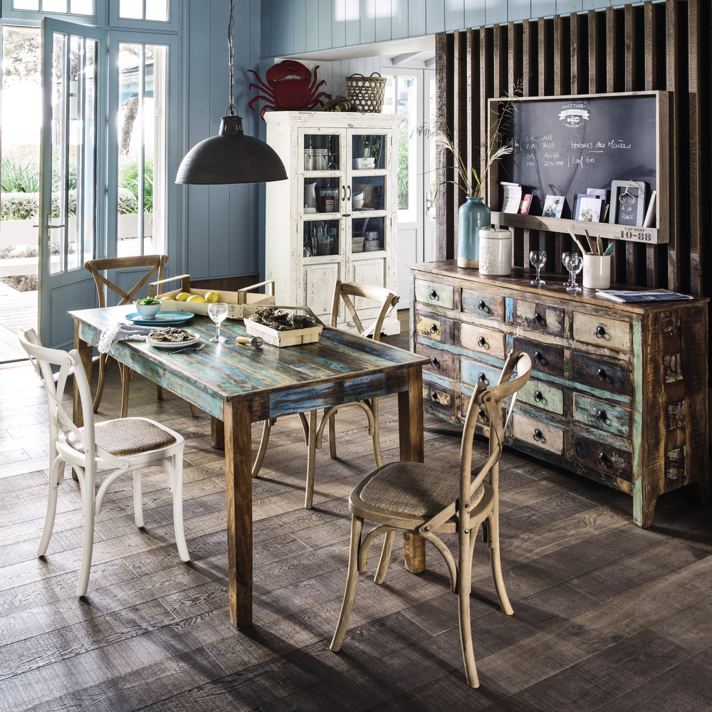 Revisitez l’esprit récup avec la table à dîner en bois recyclé CALANQUE. Conçue avec différentes variétés de bois, cette table rectangulaire vous offre un beau plateau à lattes multicolores. Patinée et cirée à la main, cette table de salle à manger est protégée par sa finition et se lave tout simplement à l’eau claire.