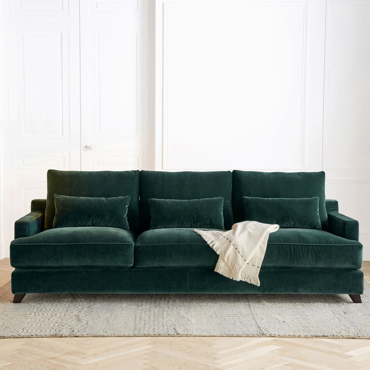 Voici la traduction en français : Un canapé à la ligne contemporaine, soulignée d’un passepoil qui