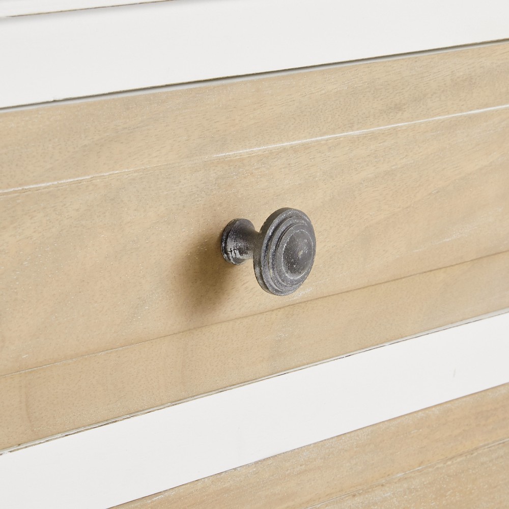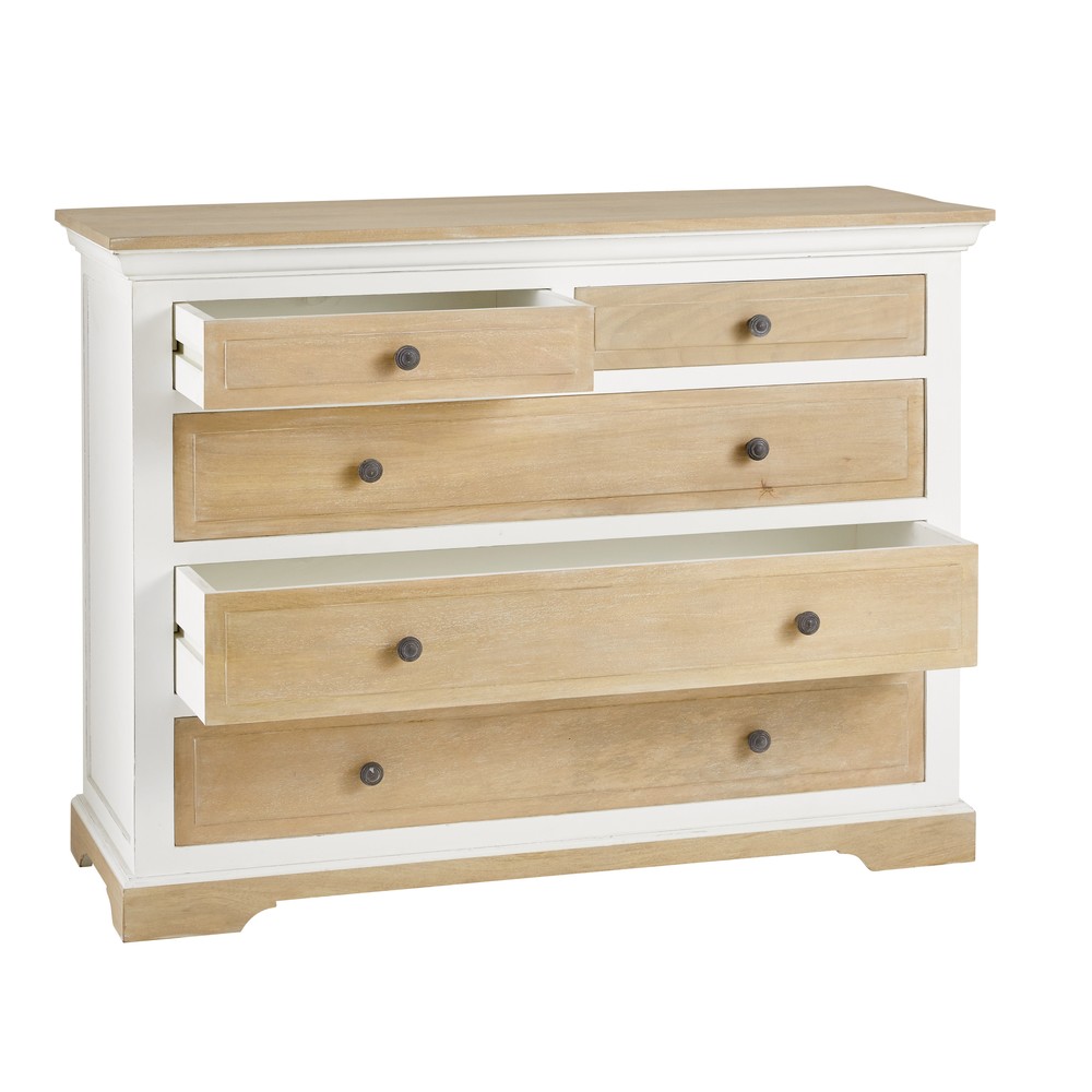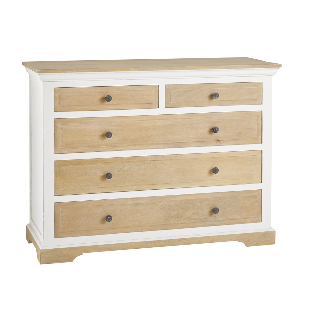 Pas le temps d’attendre les vacances pour se sentir en bord de mer ! La jolie commode 5 tiroirs en manguier blanc CEZEMBRE vous offre un rangement optimal grรขce ร ses cinq tiroirs. La structure en manguier massif blanc de cette commode de rangement apportera de jolies nuances douces et laissera une douce brise marine s’installer dans votre intรฉrieur. Le petit plus : on adore le contraste des poignรฉes en mรฉtal et les tiroirs en manguier massif !