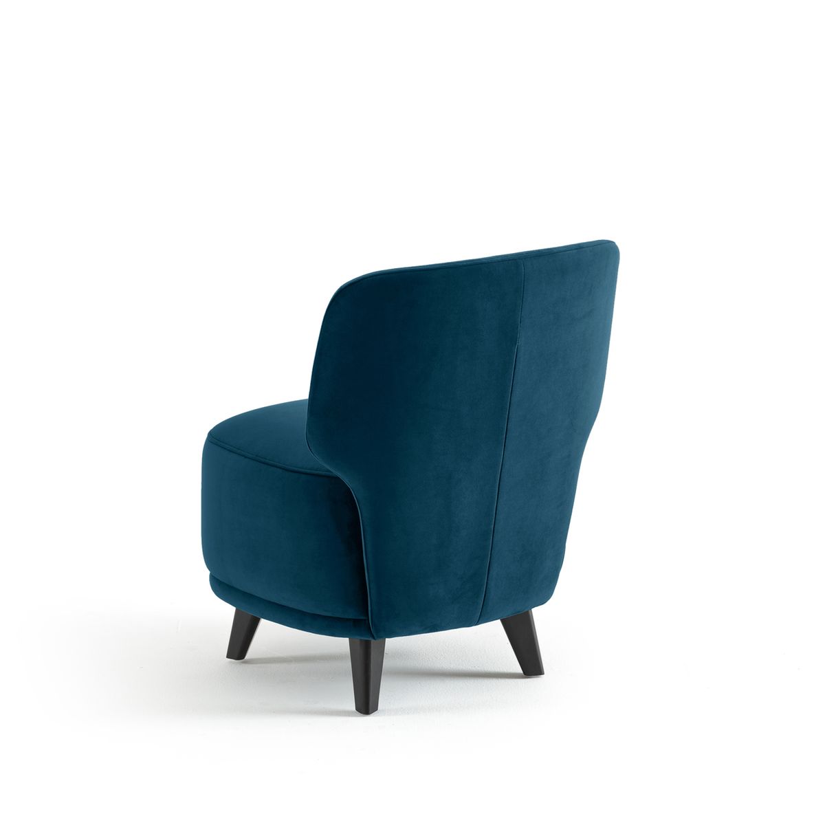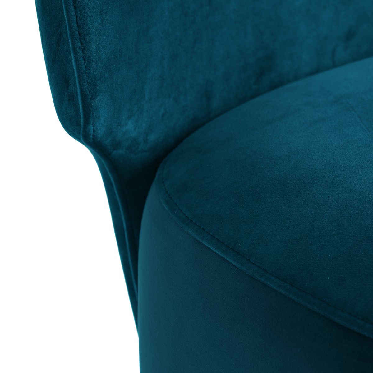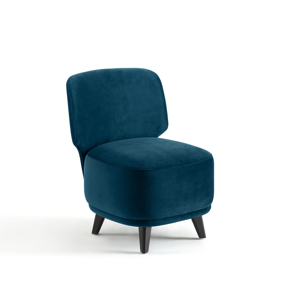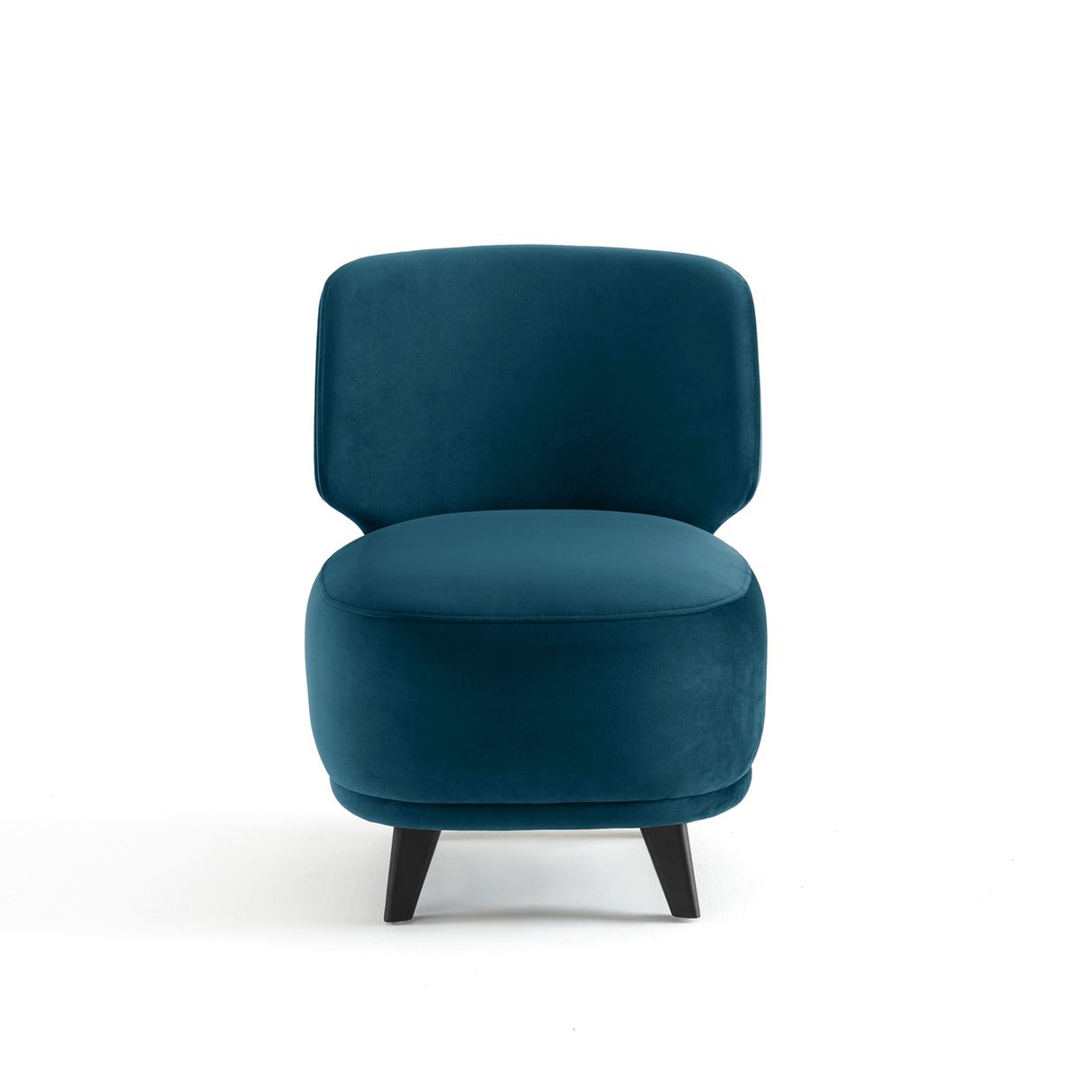 **La chauffeuse Odalie.** Son revรชtement en velours bleu paon et son design tout en rondeur invitent