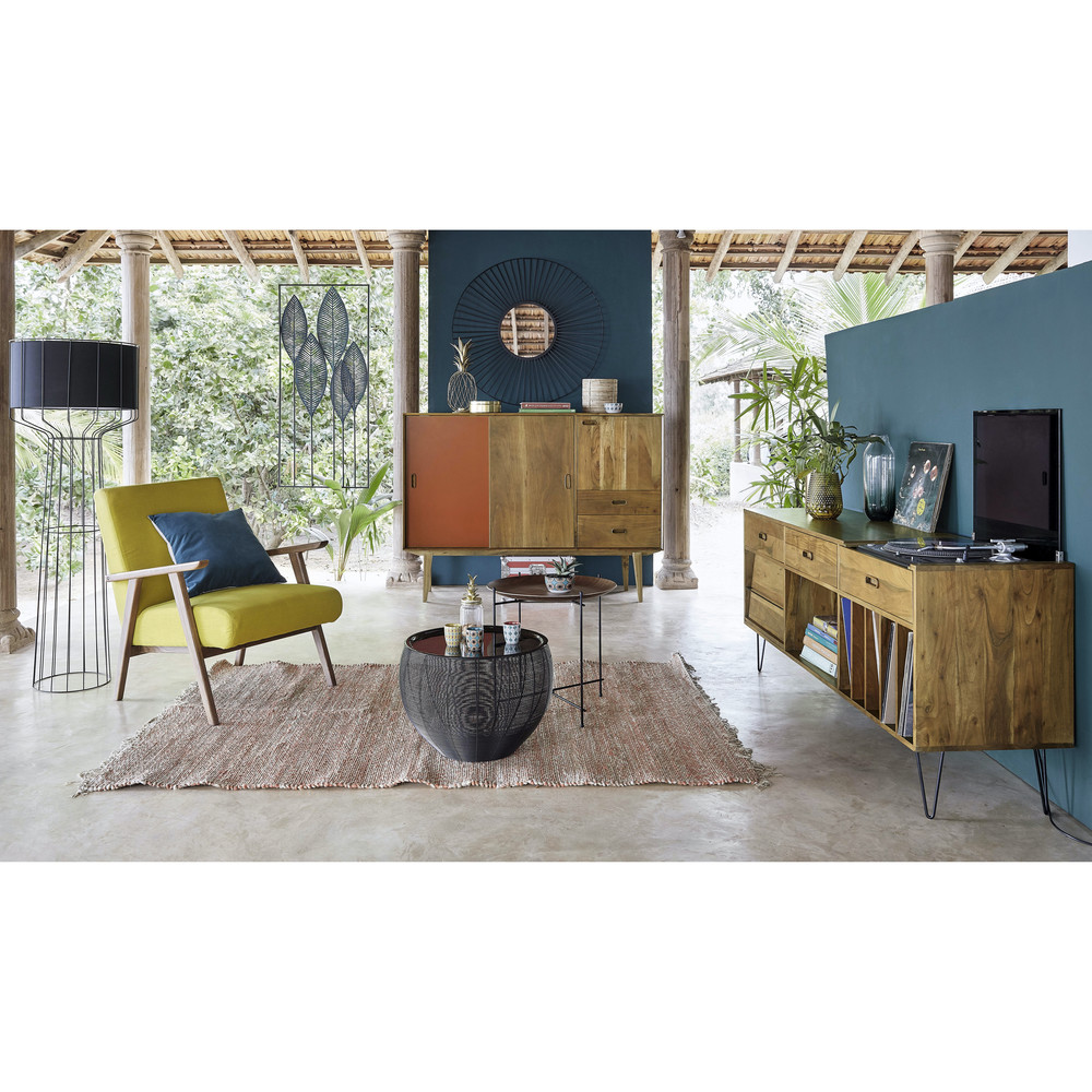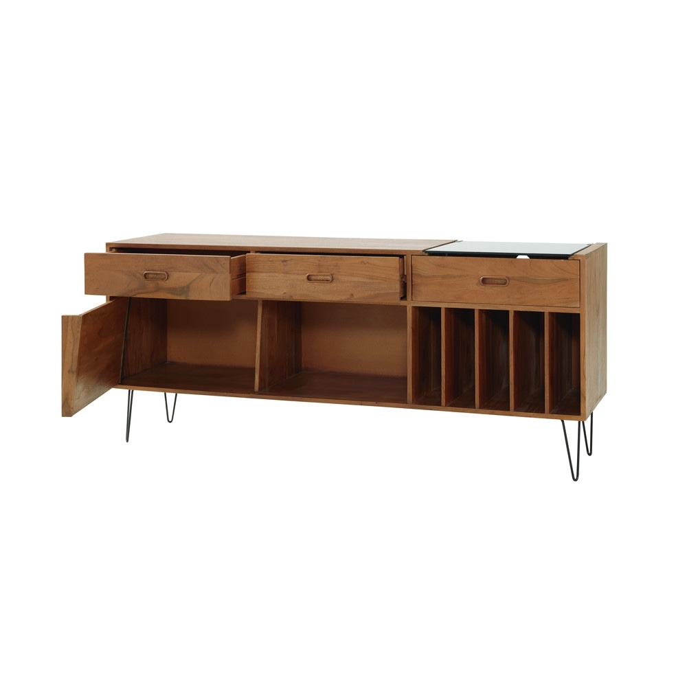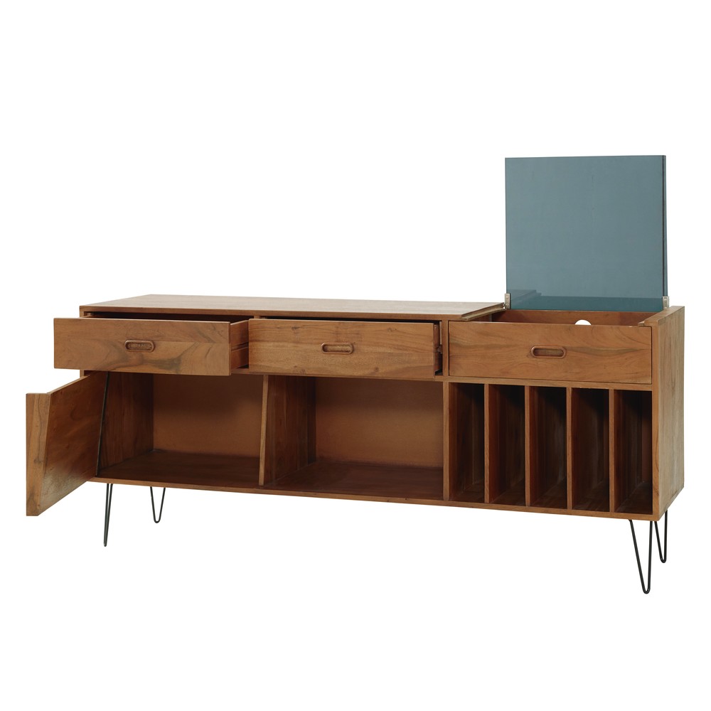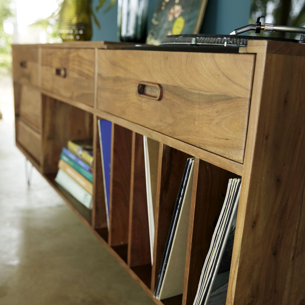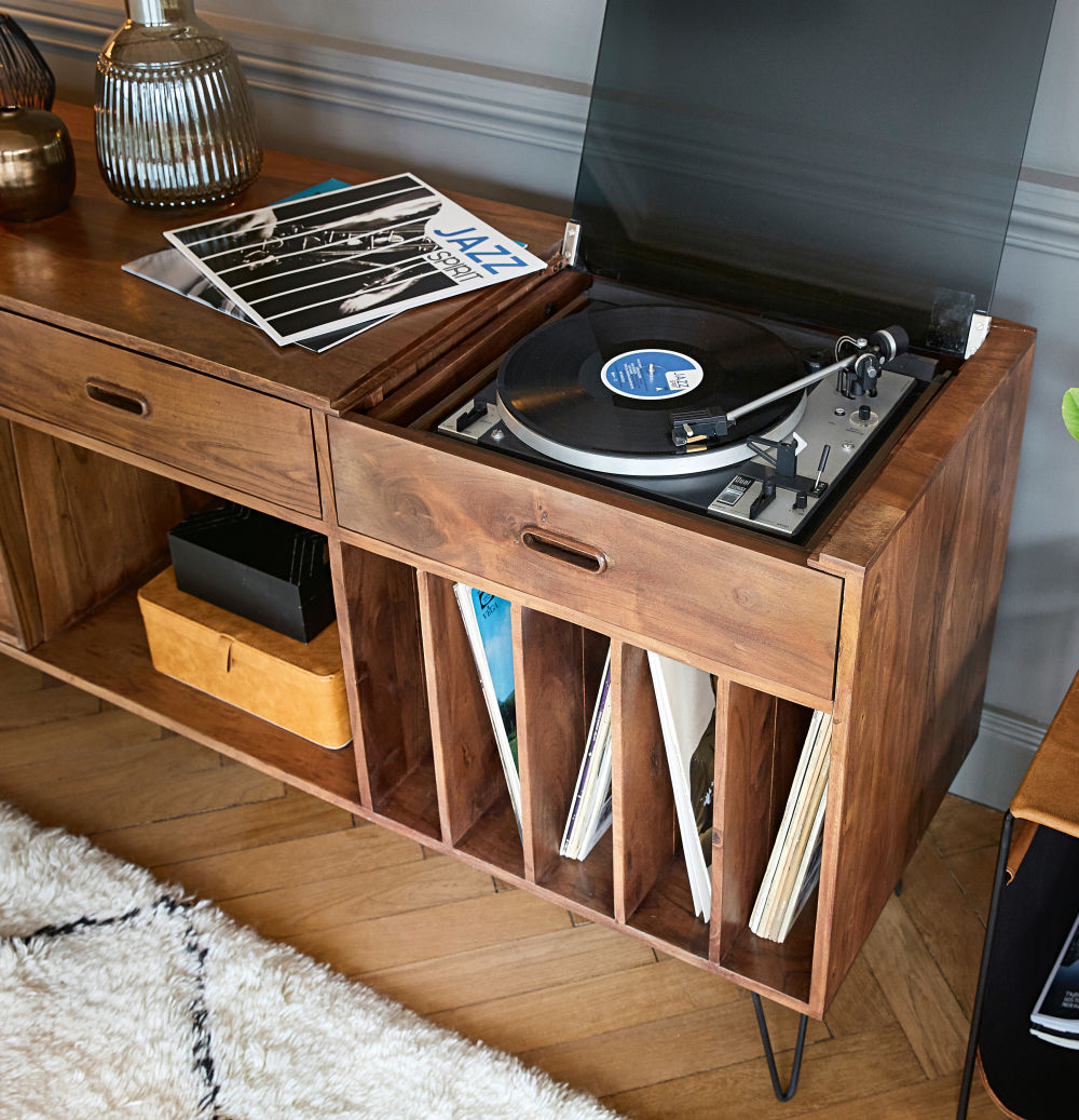 Le buffet meuble ร vinyles en acacia GIMMICK joue la carte de l’originalitรฉ avec son allure scandina