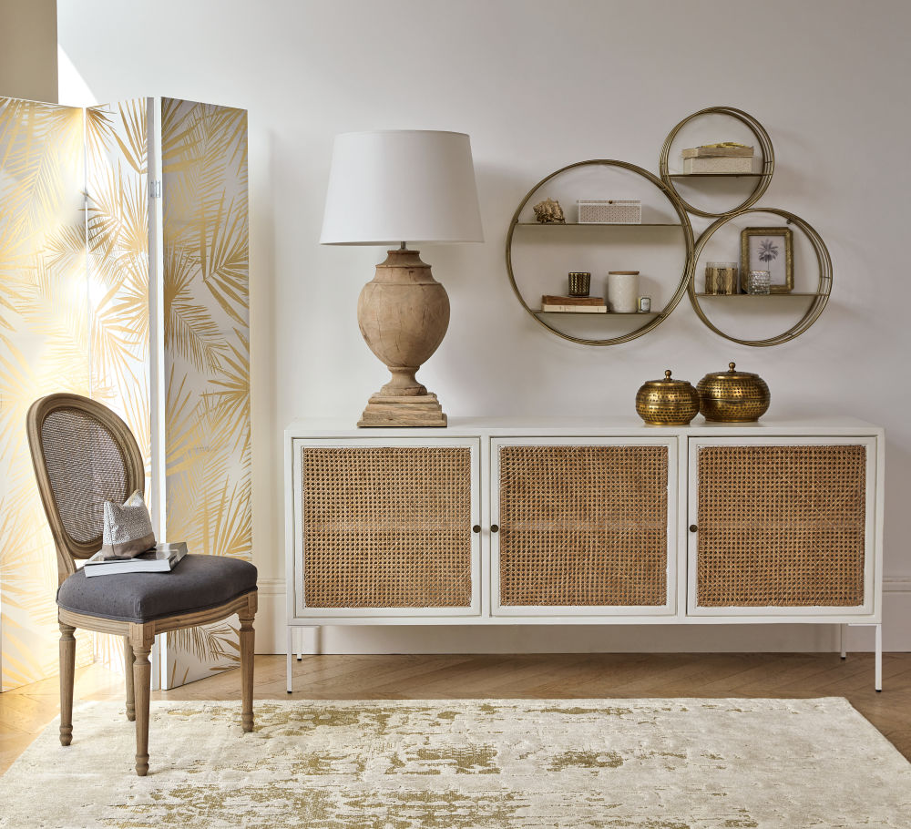 L’exotique chic arrive avec le paravent imprimé feuillage blanc et doré GOLDEN OASIS. Ses imprimés de feuilles de palmier sont modernisés grâce à leur coloris doré, ajoutant une touche de brillance élégante. Dans un intérieur contemporain ou dans une décoration inspirée des tropiques, ce paravent attirera tous les regards. N’ayez pas peur de lui offrir un petit esprit Palm Spring en l’intégrant à une décoration qui mélange des teintes de bleu et de jaune pâle. Son look n’en ressortira que mieux !