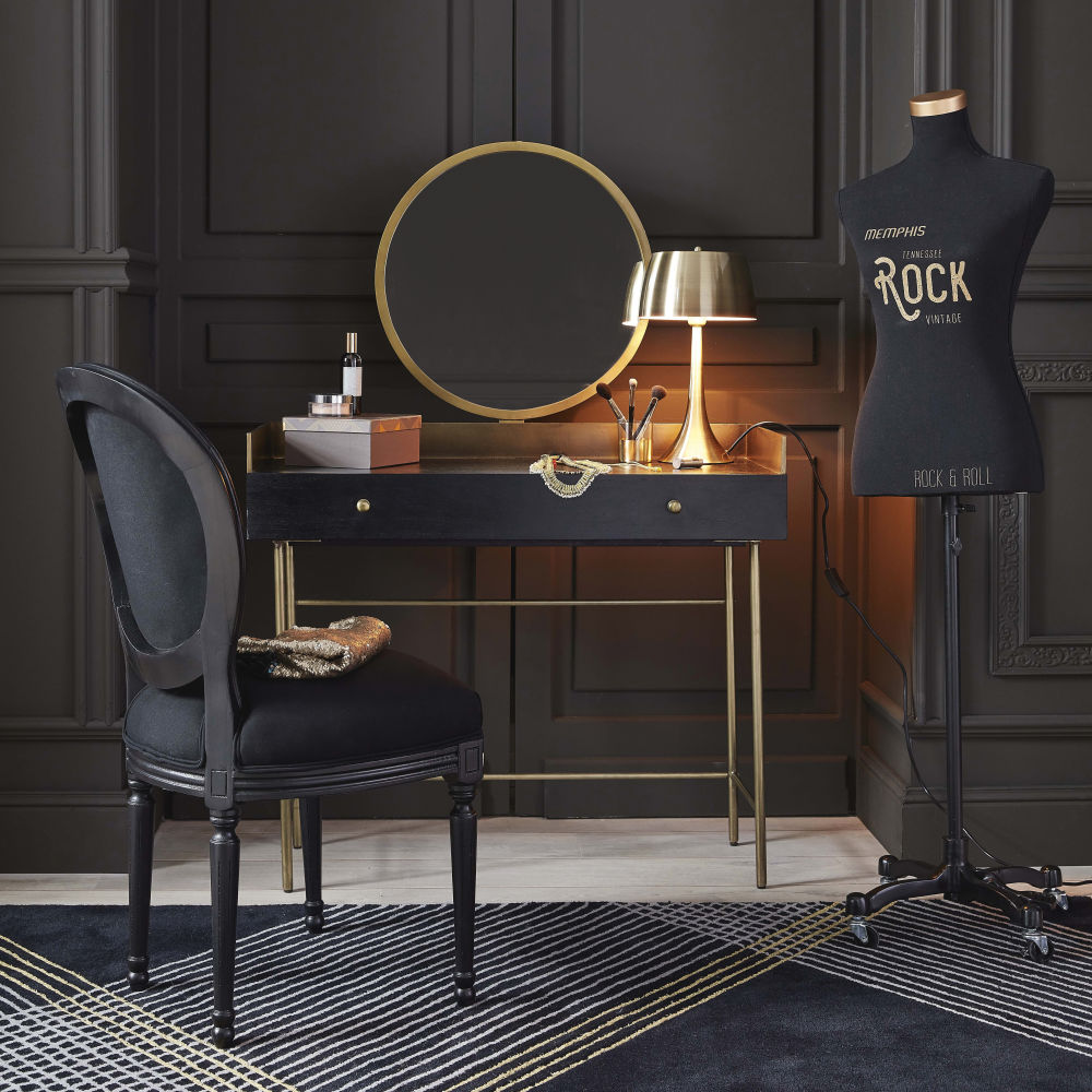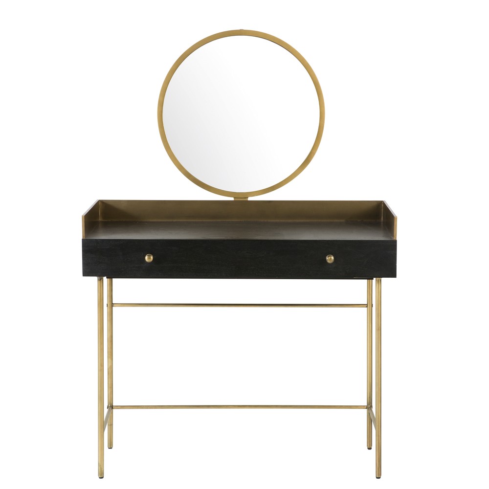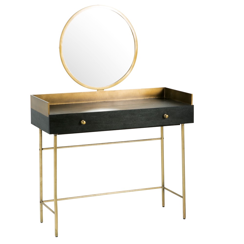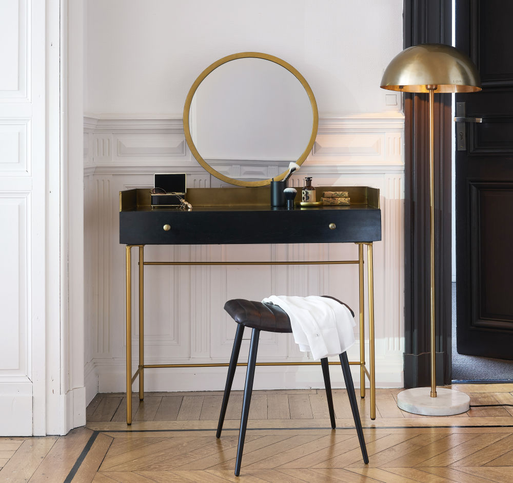Place ร la coquetterie avec la coiffeuse 1 tiroir JAGGER. En acacia massif et mรฉtal, elle vous promet une grande soliditรฉ dans le temps. Ses atouts ? Des lignes contemporaines, l’association du noir et du dorรฉ et un miroir fรฉminin. Cรดtรฉ rangement, vous pouvez retrouver un tiroir, pratique pour y stocker vos petits accessoires. Cette coiffeuse deviendra vite un รฉlรฉment indispensable dans une chambre.