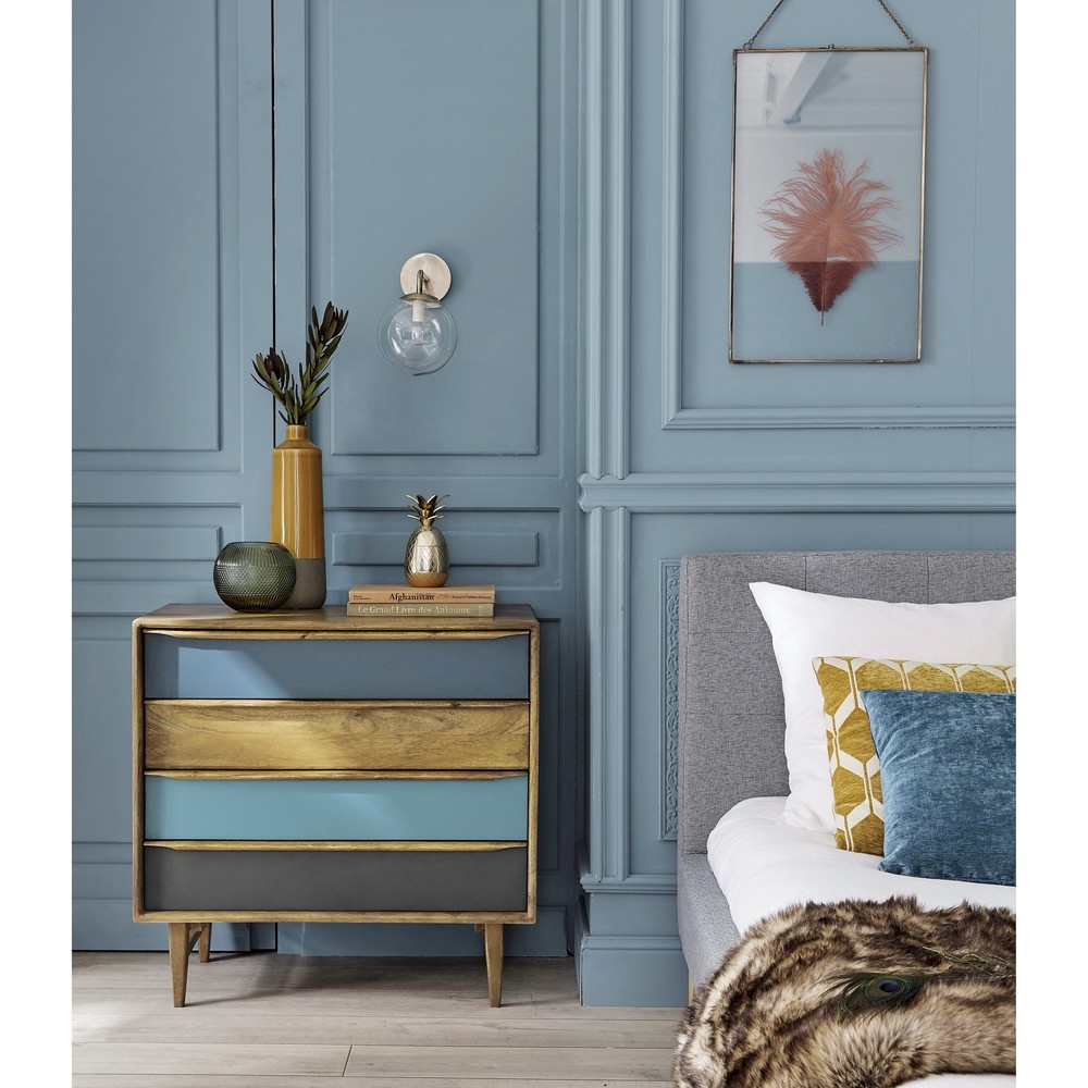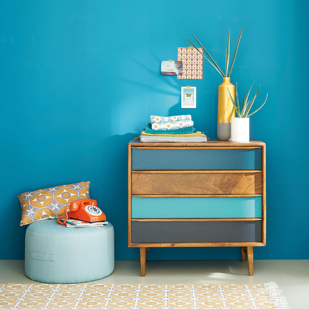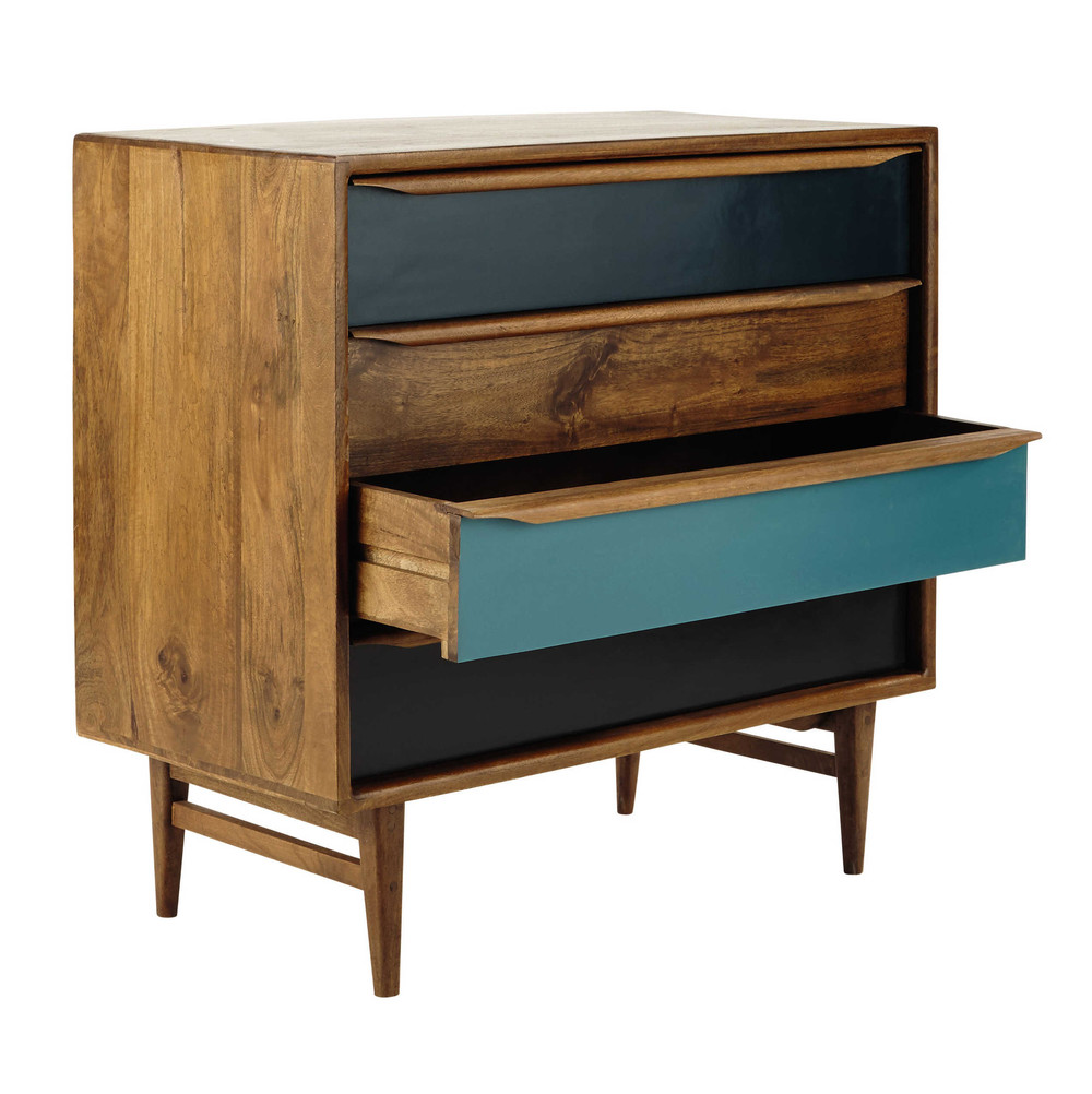 La commode vintage en manguier JANEIRO créera une ambiance chaleureuse dans votre pièce. Avec ses pieds obliques au look rétro, cette commode en bois vous offrira les rangements nécessaires avec 4 grands tiroirs. Le must ? Le dégradé de couleurs qui anime les tiroirs. Notre conseil : décorez son plateau avec une jolie plante verte ou une belle lampe du même style. Qu’en dites-vous ?