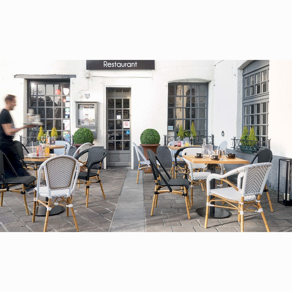 Tout droit inspirรฉ des terrasses parisiennes, le fauteuil de jardin professionnel en rรฉsine noire KAFE PRO propose ร vos clients une halte en plein air ! Fabriquรฉ en aluminium traitรฉ รฉpoxy, il apportera une touche de naturel dans les lieux conviviaux grรขce ร son imitation bambou trรจs rรฉussie. Ce fauteuil de jardin de style bistrot propose รฉgalement un revรชtement en rรฉsine de polyรฉthylรจne pour allier confort et robustesse. Parfait pour boire un cafรฉ sur une place, siroter un cocktail en terrasse ou dรฉguster un bon repas dans un patio…
