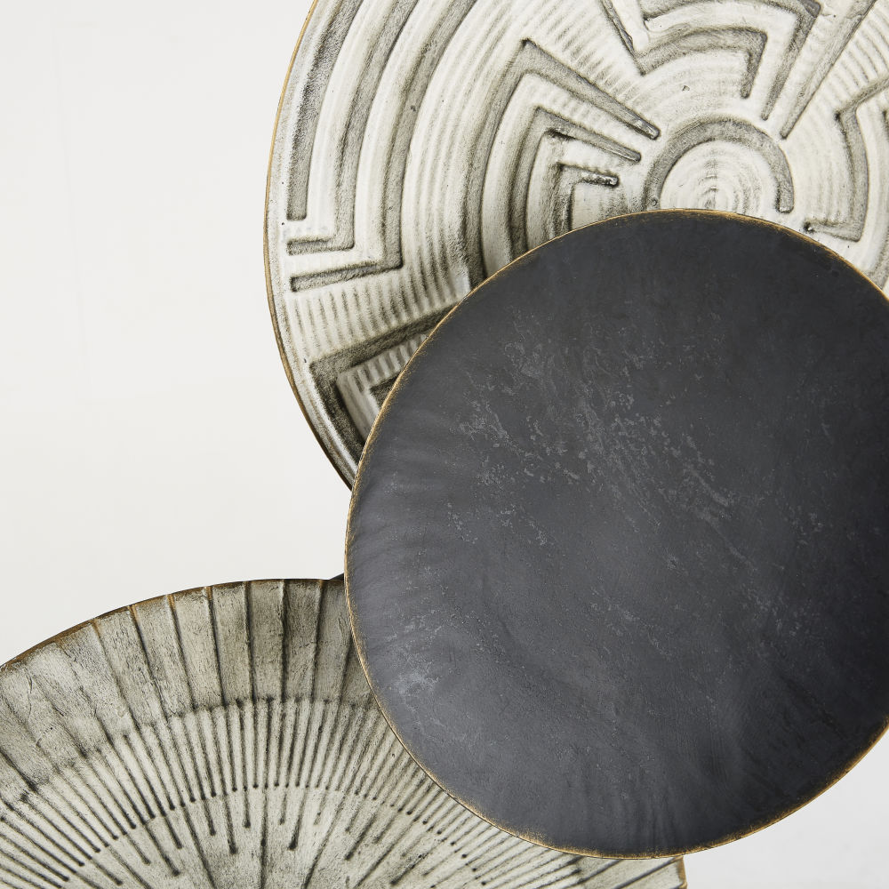 Inspiré par le charme exotique de l’artisanat africain, la décoration murale en disques de métal noir et gris gravé LUANDA apportera une ambiance chaleureuse à votre séjour. À placer à l’horizontale ou à la verticale, vous pourrez la mettre en valeur près d’une grande plante verte ou d’une vasque en céramique texturée. Associez cette déco murale à un miroir en rotin noir et des masques en bois pour un esprit tribal élégant !
