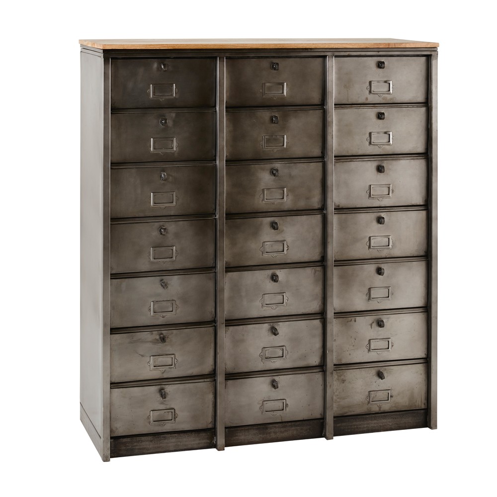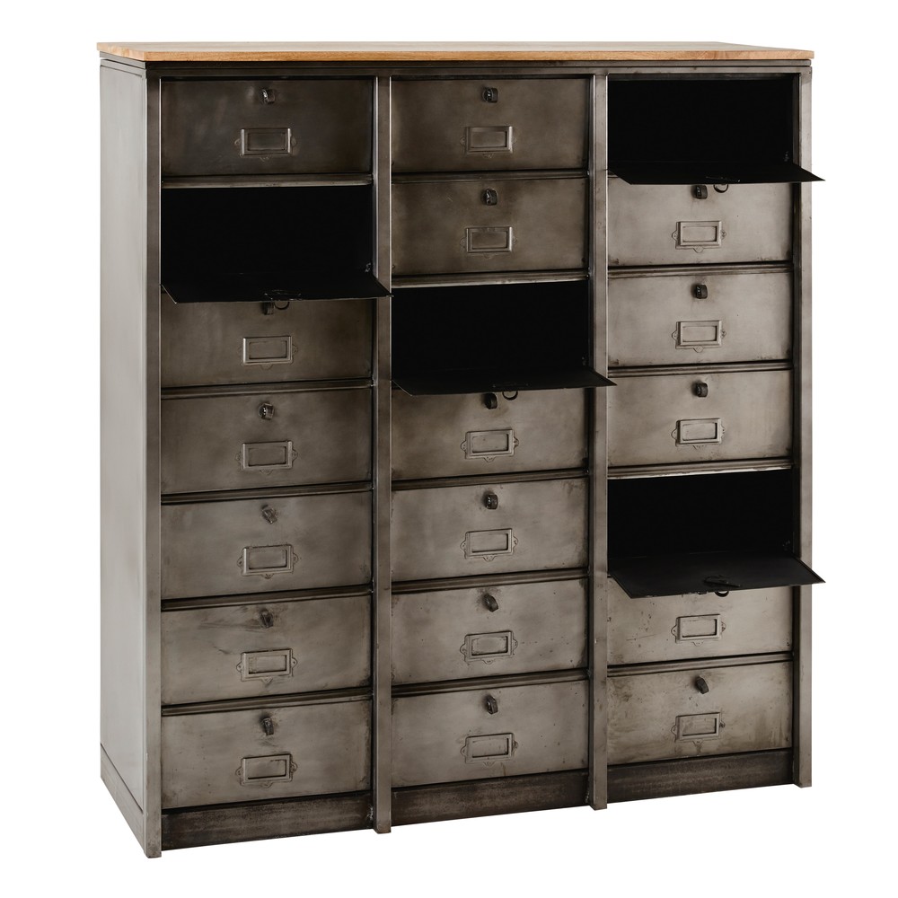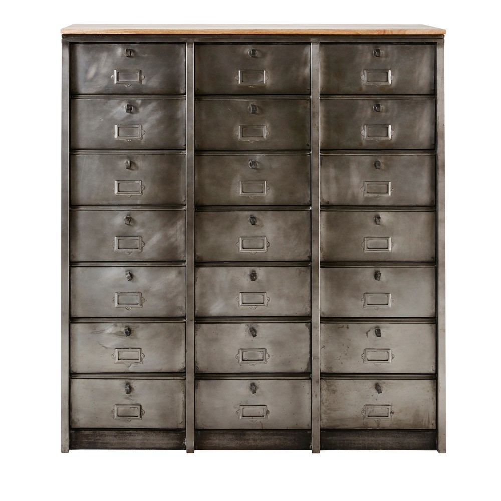 Amateurs de mobilier ancien et de déco ambiance factory ? Vous allez être séduits par le cabinet indus en métal MABILLON ! Au-delà de son allure brutale et imposante, ce meuble de rangement industriel saura se distinguer dans votre intérieur grâce à son originalité. Le bois de manguier s’invite par touche, sous forme d’un plateau supérieur discret. Ce cabinet dispose de 21 tiroirs, soit 21 raisons de plus pour trier et ranger toutes vos affaires !
