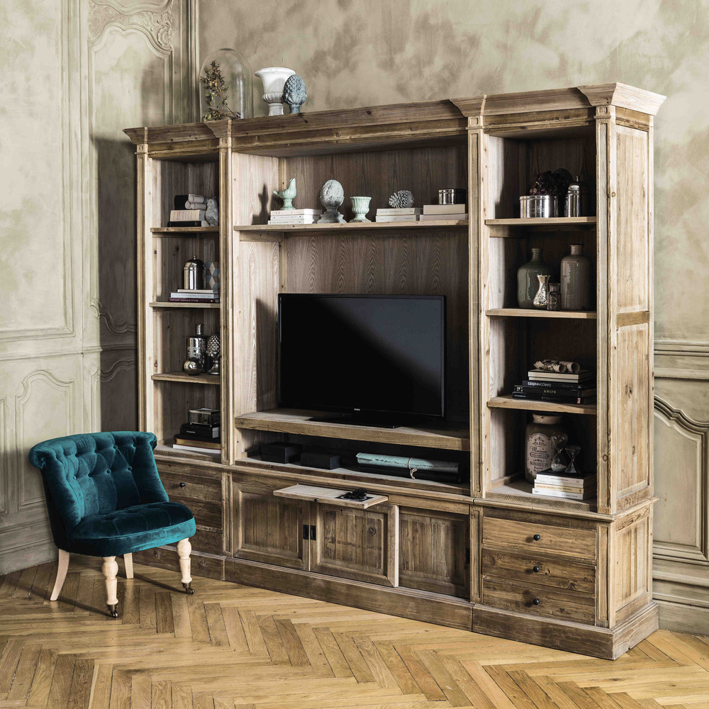 Voyez grand avec la bibliothèque meuble TV PASSY ! Cette bibliothèque en bois de pin recyclé vous propose un agencement idéal pour ranger tous vos équipements de salon. Ce meuble de rangement se compose d’une partie basse avec 2 blocs de 3 tiroirs, une partie haute avec 3 étagères amovibles et un corps central avec 2 étagères amovibles et 3 portes coulissantes. Un meuble complet qui mettra en valeur votre ameublement de style classique.