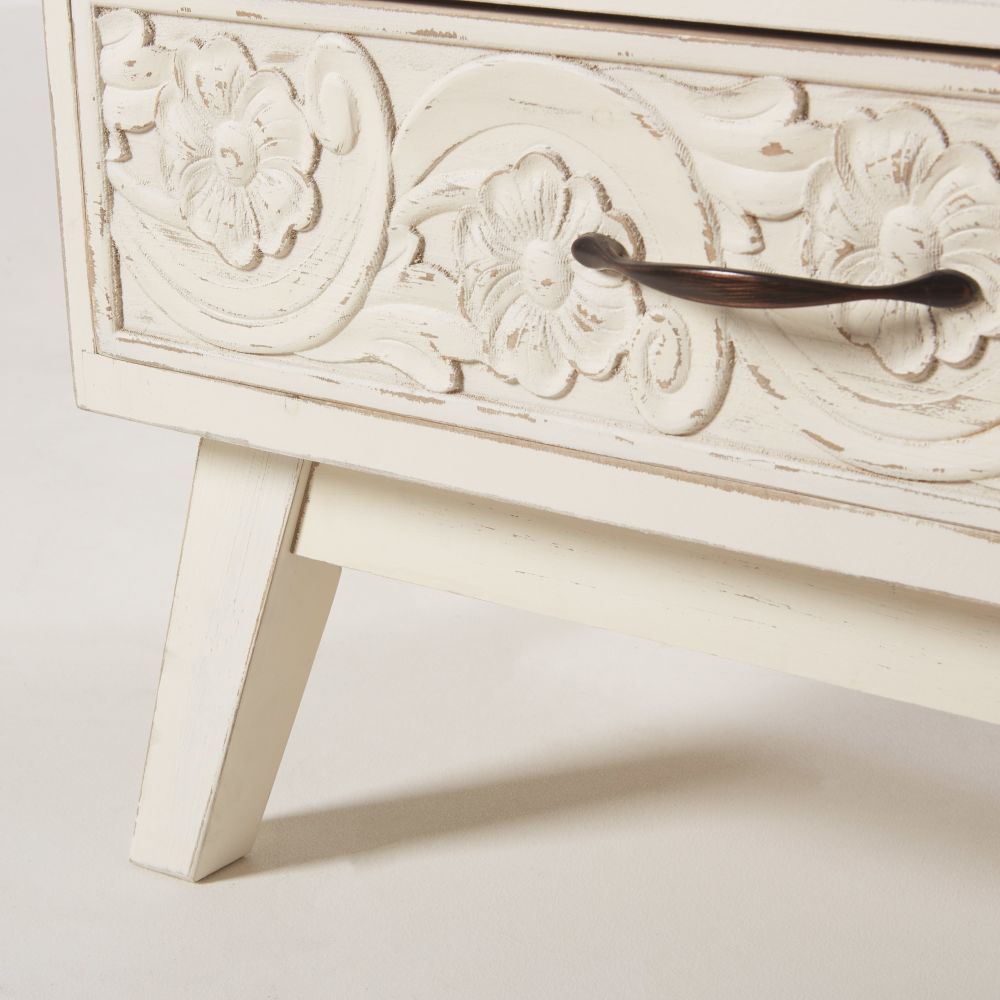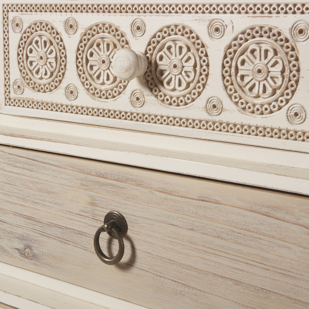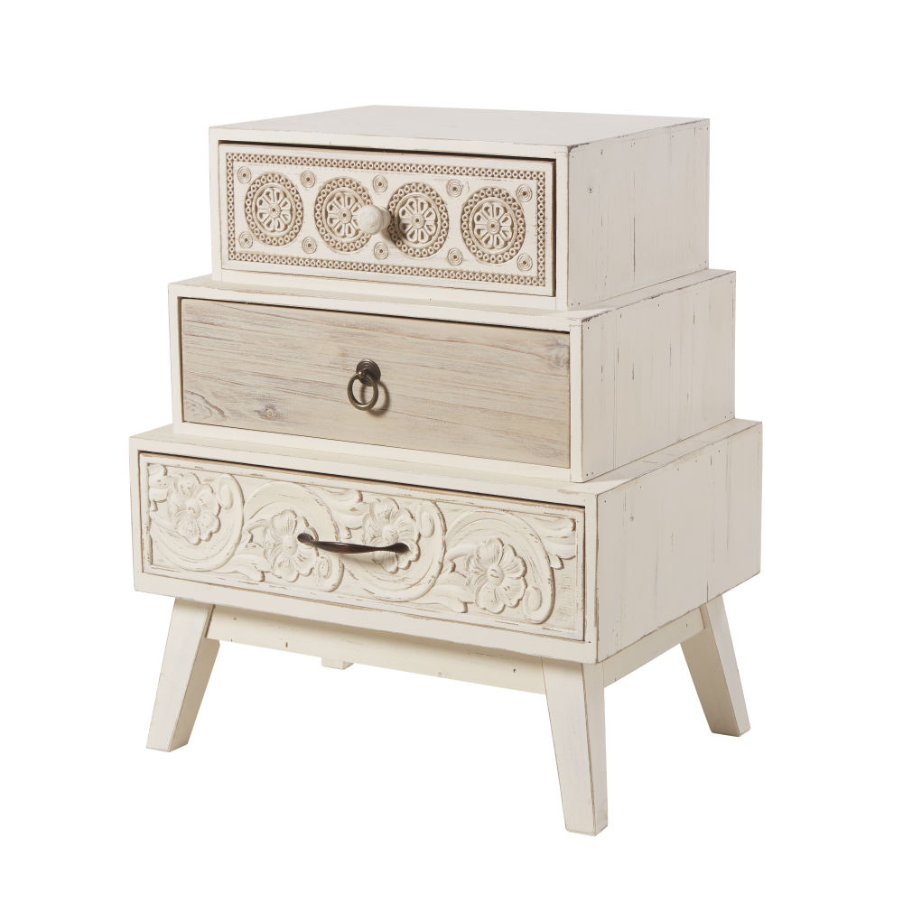 Le bois de ce meuble est certifiรฉ FSC. Ce label garantit que le bois provient d’une forรชt gรฉrรฉe de maniรจre responsable : vous aussi, participez ร la prรฉservation des forรชts et de la biodiversitรฉ en choisissant ce produit. Voyage, exotisme, authenticitรฉโฆ Nombreux sont les mots pour dรฉcrire la table de chevet dรฉstructurรฉe ร motifs RUMBA. Trois tiroirs ร motifs accompagnent la structure en sapin et les pieds en pin massif blanchi. De dimensions diffรฉrentes, les trois tiroirs accueilleront vos lectures du soir et autres accessoires. Notre conseil : pour complรฉter le look exotique de cette table de nuit, placez une lampe du mรชme style sur son plateau.