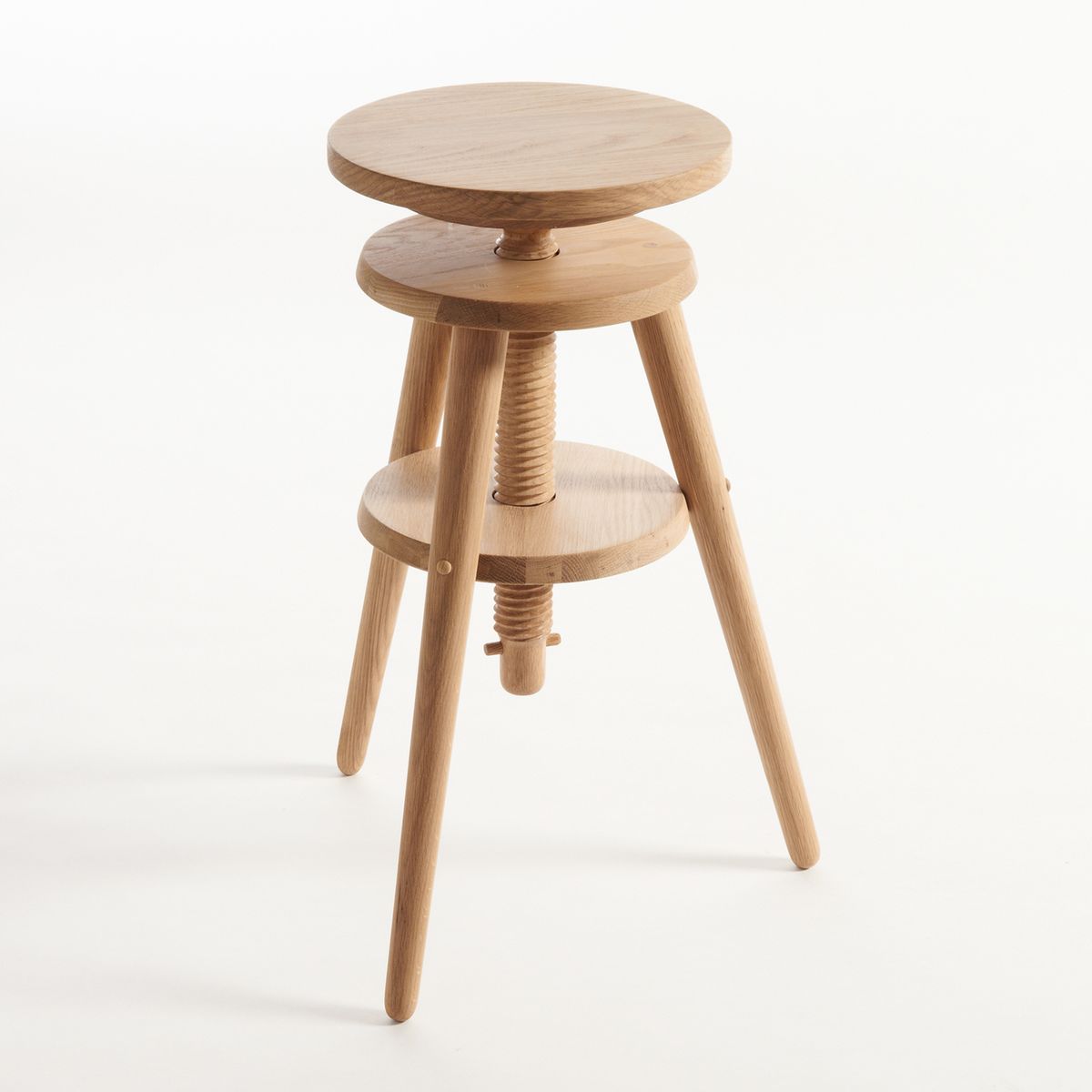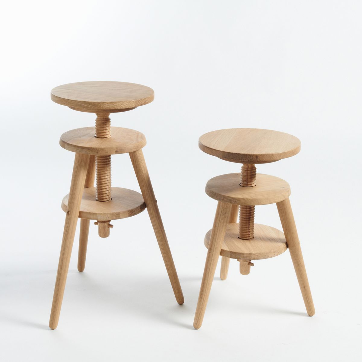 Le tabouret Evolutiva. Un siège polyvalent grâce à sa hauteur réglable très facilement en tournant son assise à vis.