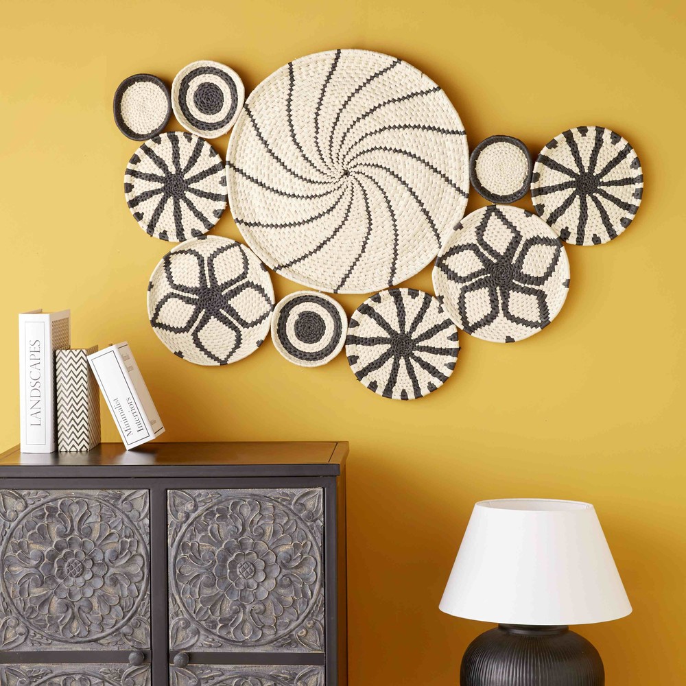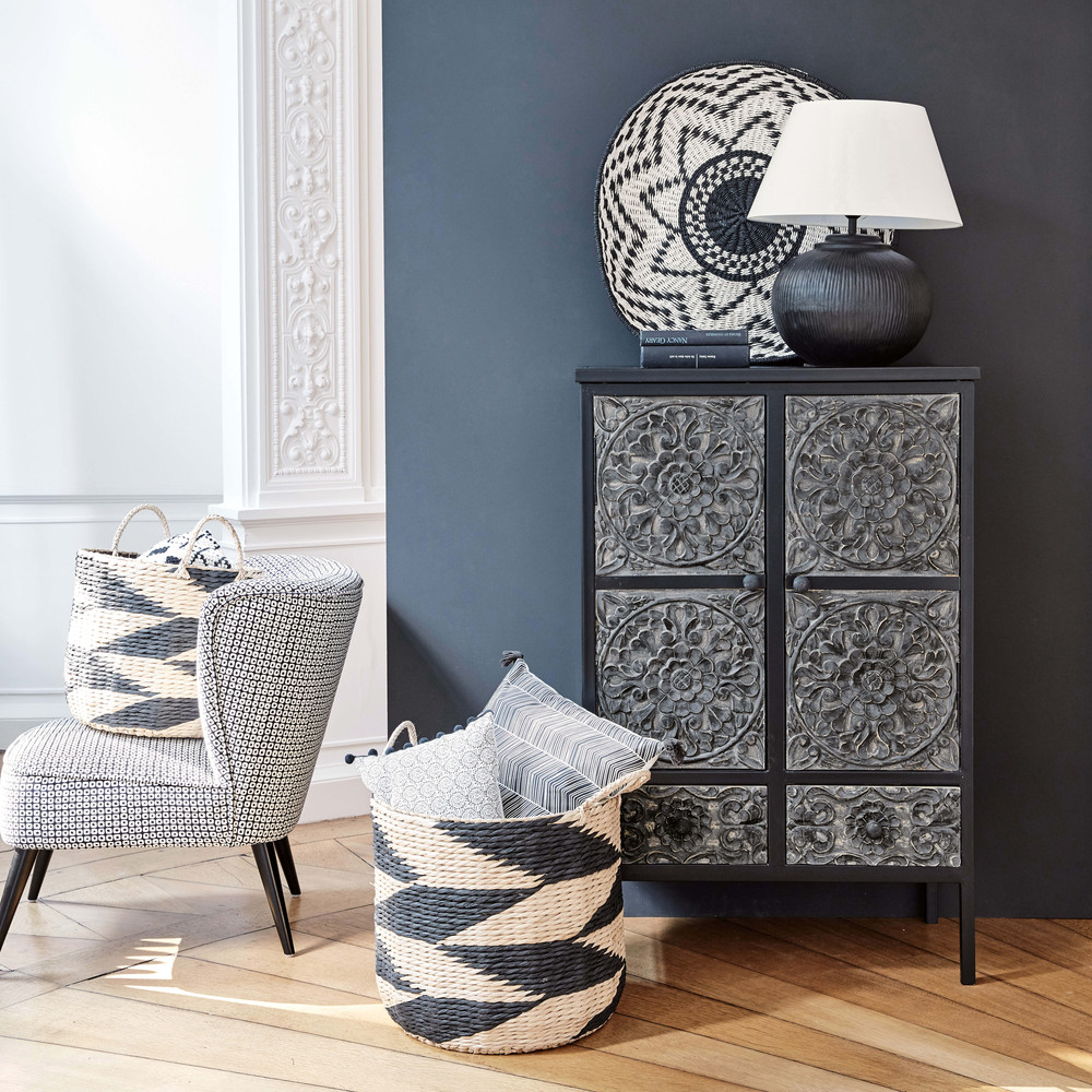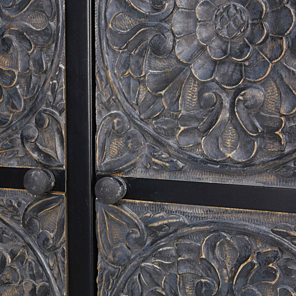 Ce meuble de rangement vous séduira avec son design raffiné et ses détails originaux. Sa structure en métal noir mat est dotée de façades en bois sculpté à la main, ornées de motifs ethniques et délicatement teintées de noir.